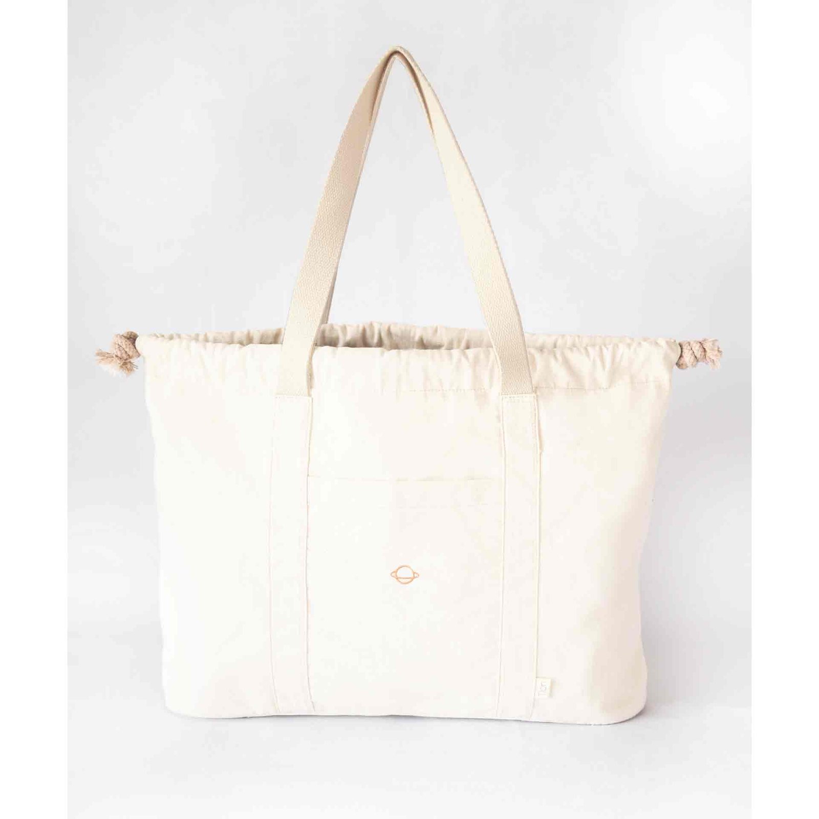 Exterior of organic cotton canvas, vintage effect, ecru color. With interior lining, two large pockets, key hook and regulating rope for easy opening and closing.
