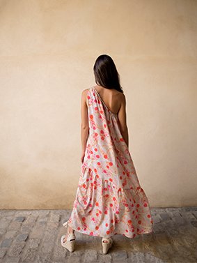 Long wide dress with an asymmetrical neckline fitted with elastic.